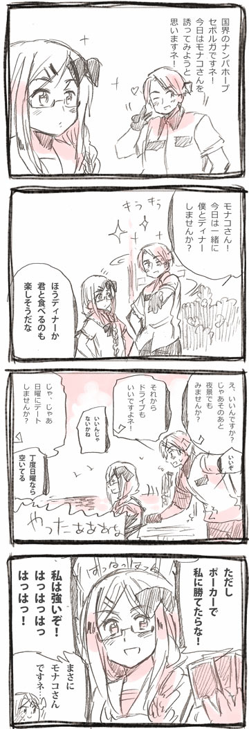 | 「セボルガ君がナンパに成功するところが見たいです 欲を言うと相手はヘタリア女子達の面々で!」 |