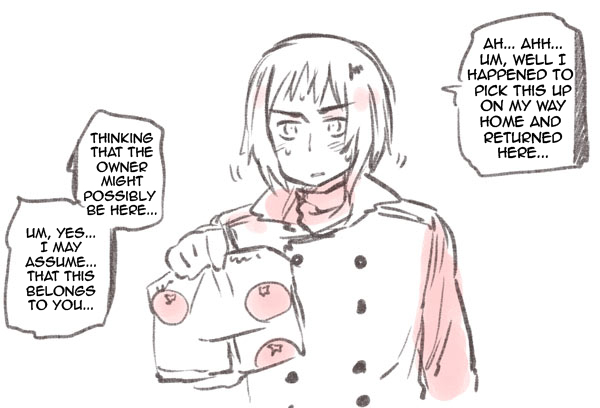 ![]() | I’m not like Germany who could take the initiative in stating one’s opinion or skillfuly put together a pose. And please tell me beforehand that this is a worldwide broadcast, idiot. I could sing Marcelino’s song with all my strength just because of the embarrassment. |