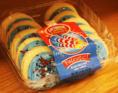 Eating blue sweets while working.